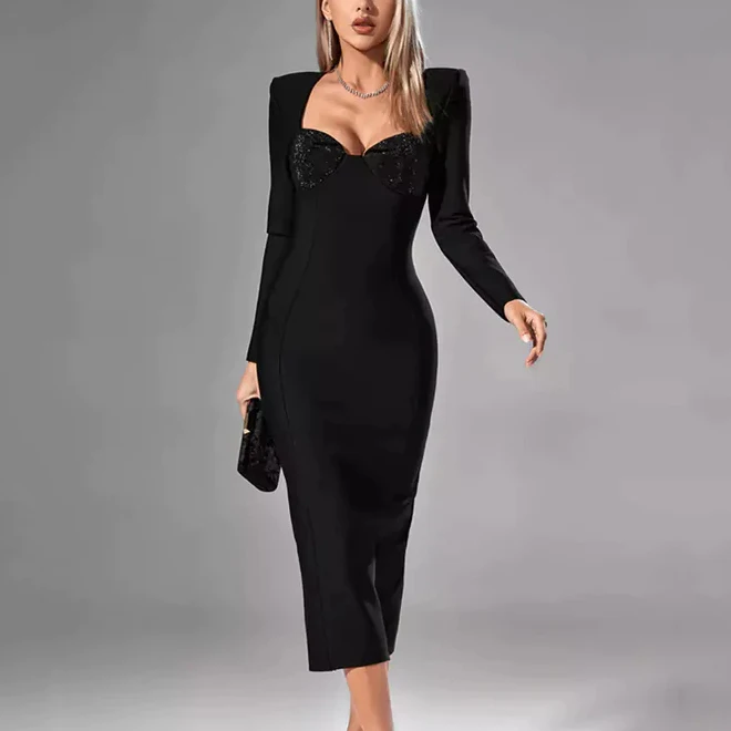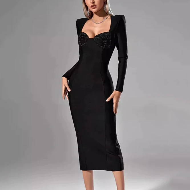 Custom Ladies Formal Office Bodycon Dress Elegant Split Square Neck Midi Solid Casual Dinner Evening Dress Manufacturer